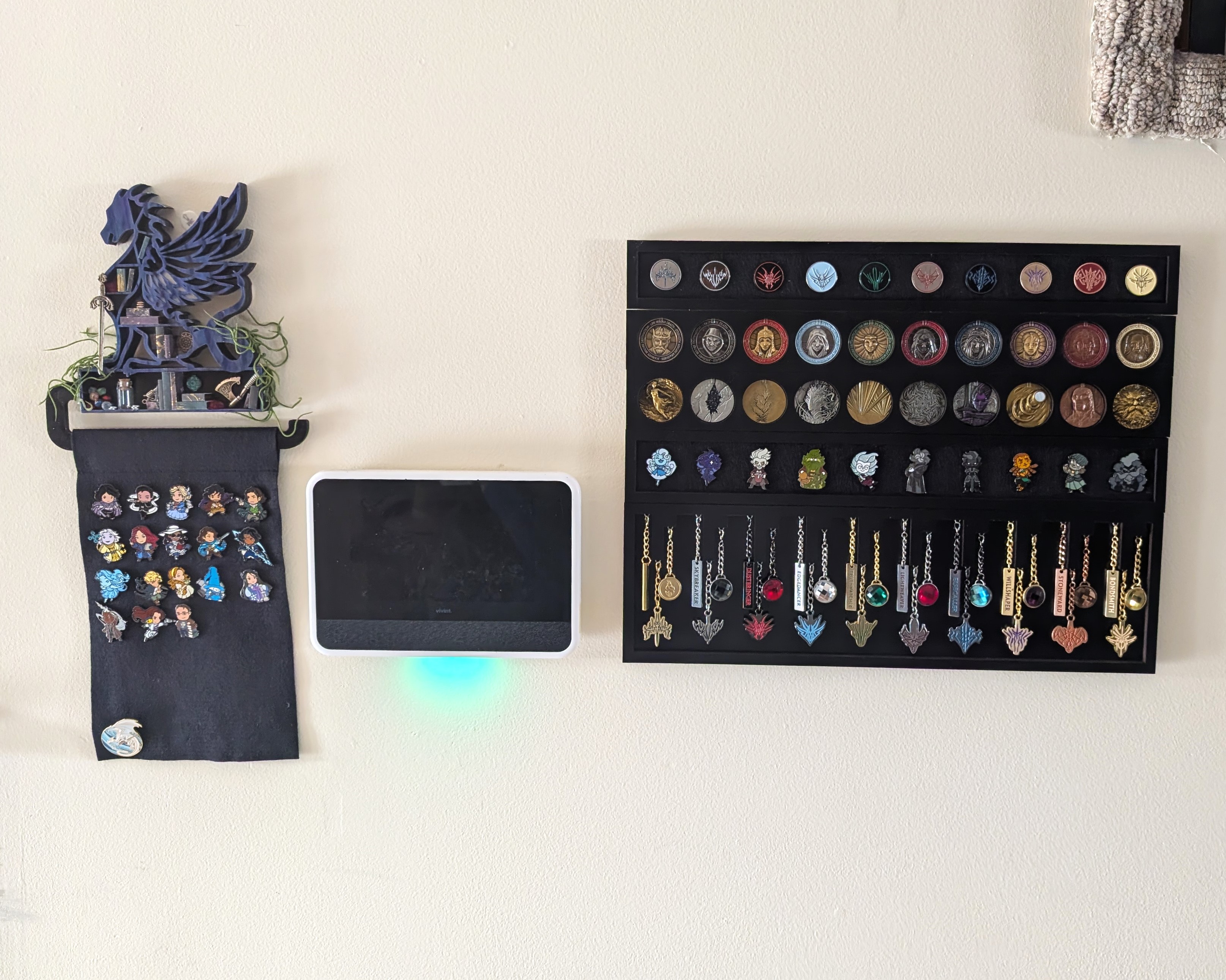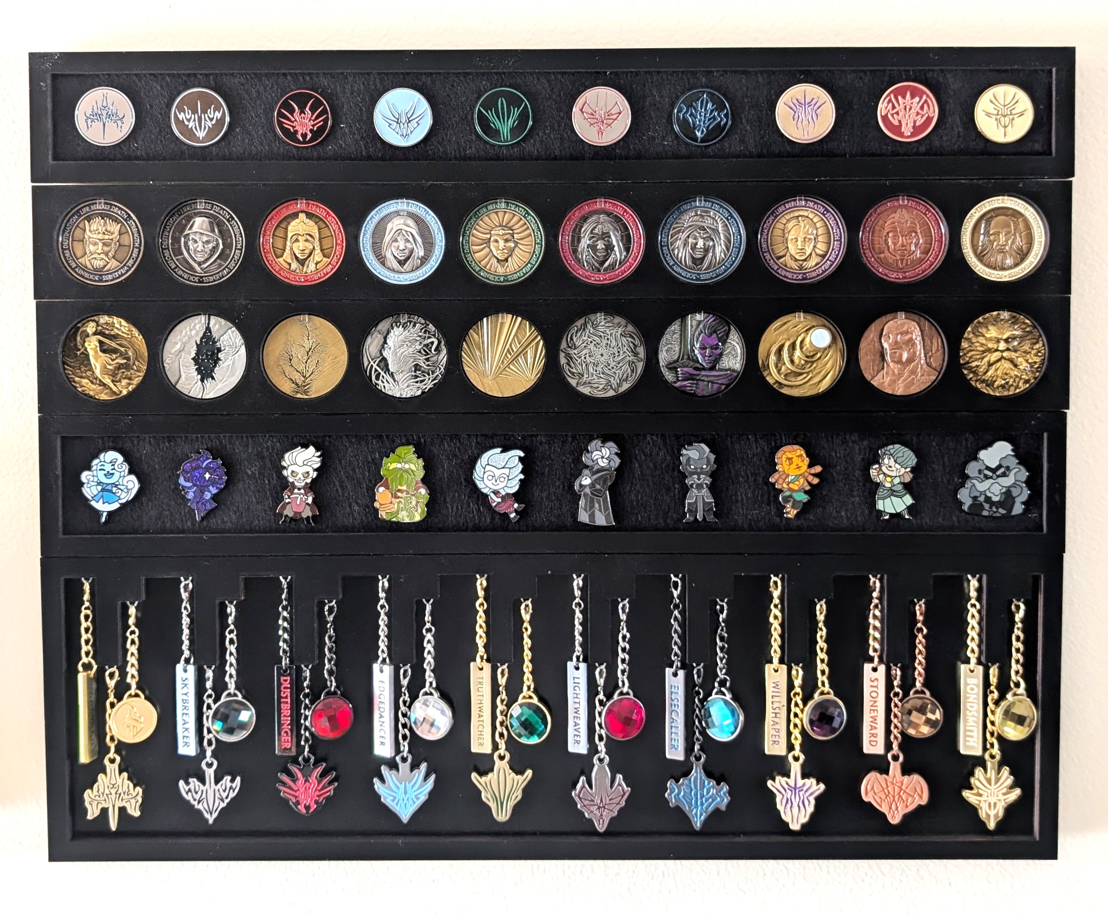 Display all of your cool radiant order merchandise! Each “row” is an individual display. This listing is for the two rows that hold the 2020 Kickstarter merch- the herald coins and order pins. If you want the three rows for the 2024 Words of Radiance Kickstarter collection, they can be purchased on the other listing (linked below). The coins are held in with tiny clear plastic tabs.