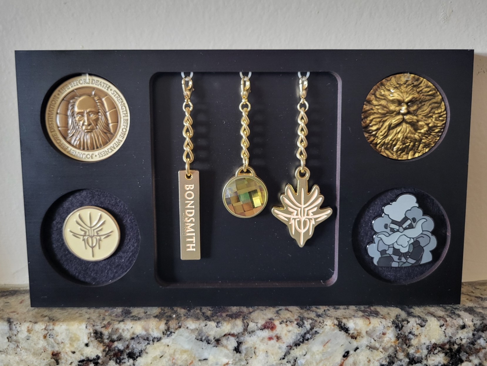 Display all of your cool radiant order merchandise! This display is for a single order- the herald coin and pin from the 2020 Way of Kings kickstarter (now available for purchase through the Dragonsteel st0re), and the spren coin, spren pin, and charm set from the 2024 Words of Radiance Kickstarter. You could of course put different coins (1.5″) and pins in the appropriate spots 🙂 MERCHANDISE NOT INCLUDED. Size: 7.75″ x 4.5″. 1 set of command strips and 2 corner bumpers are included for hanging.