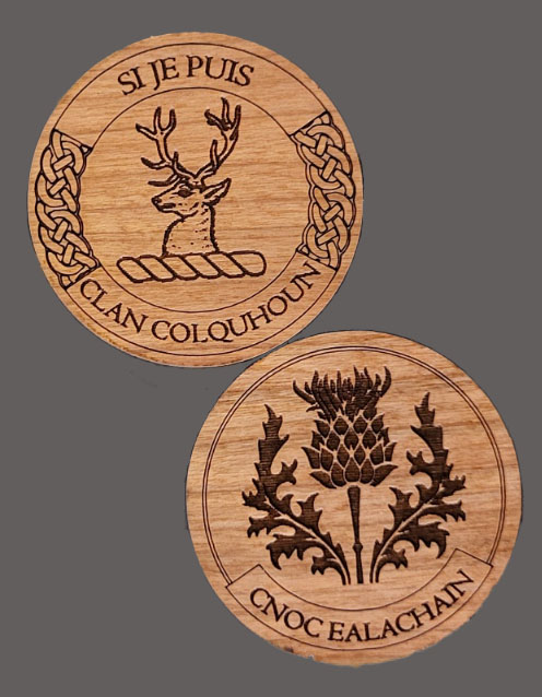 Clan Colquhoun coins! Great for giving out as favors at Highland Games. Double sided- the deer is always on the front, and you can choose from three different backs (cow, swords, thistle). Cut from MDF with cherry wood veneer.